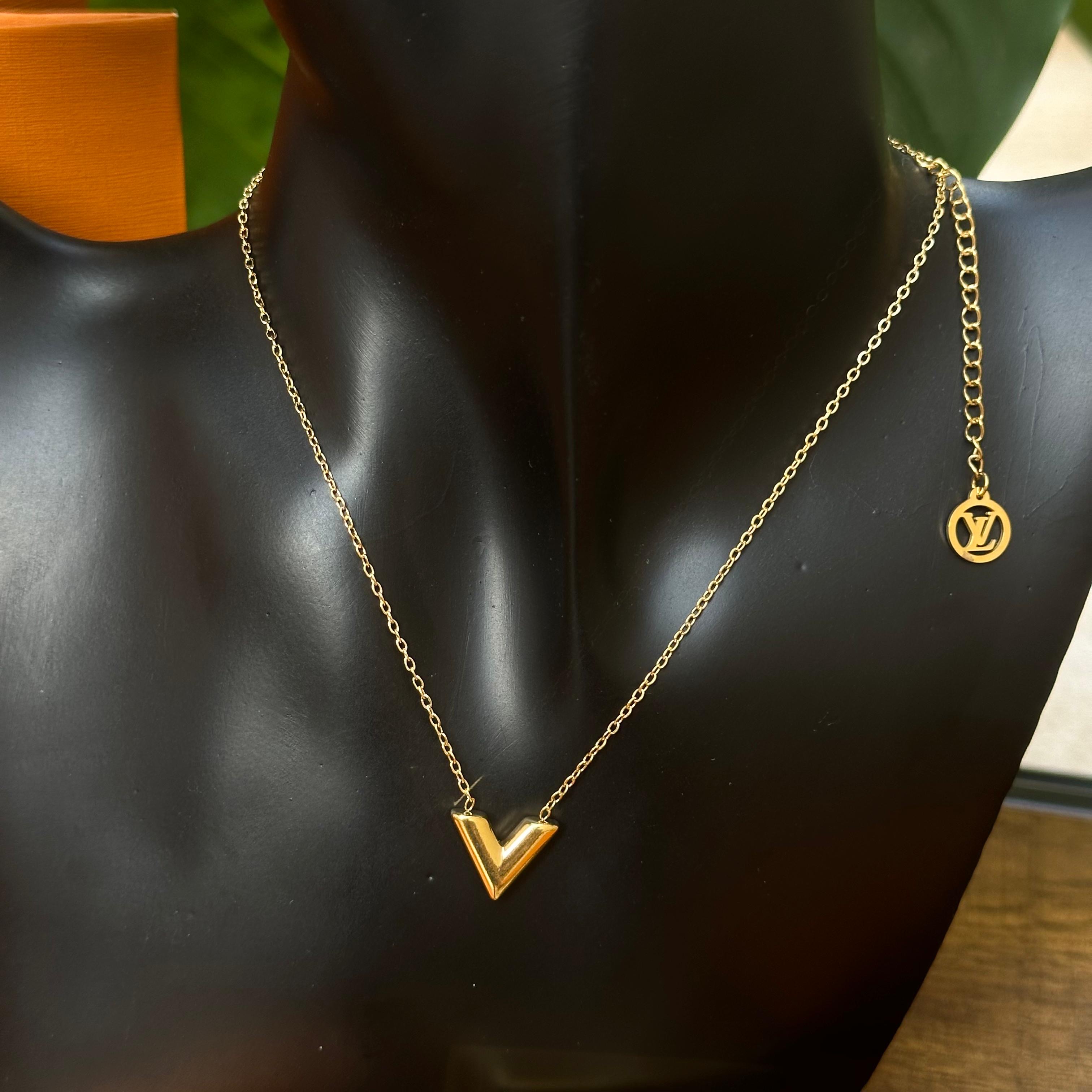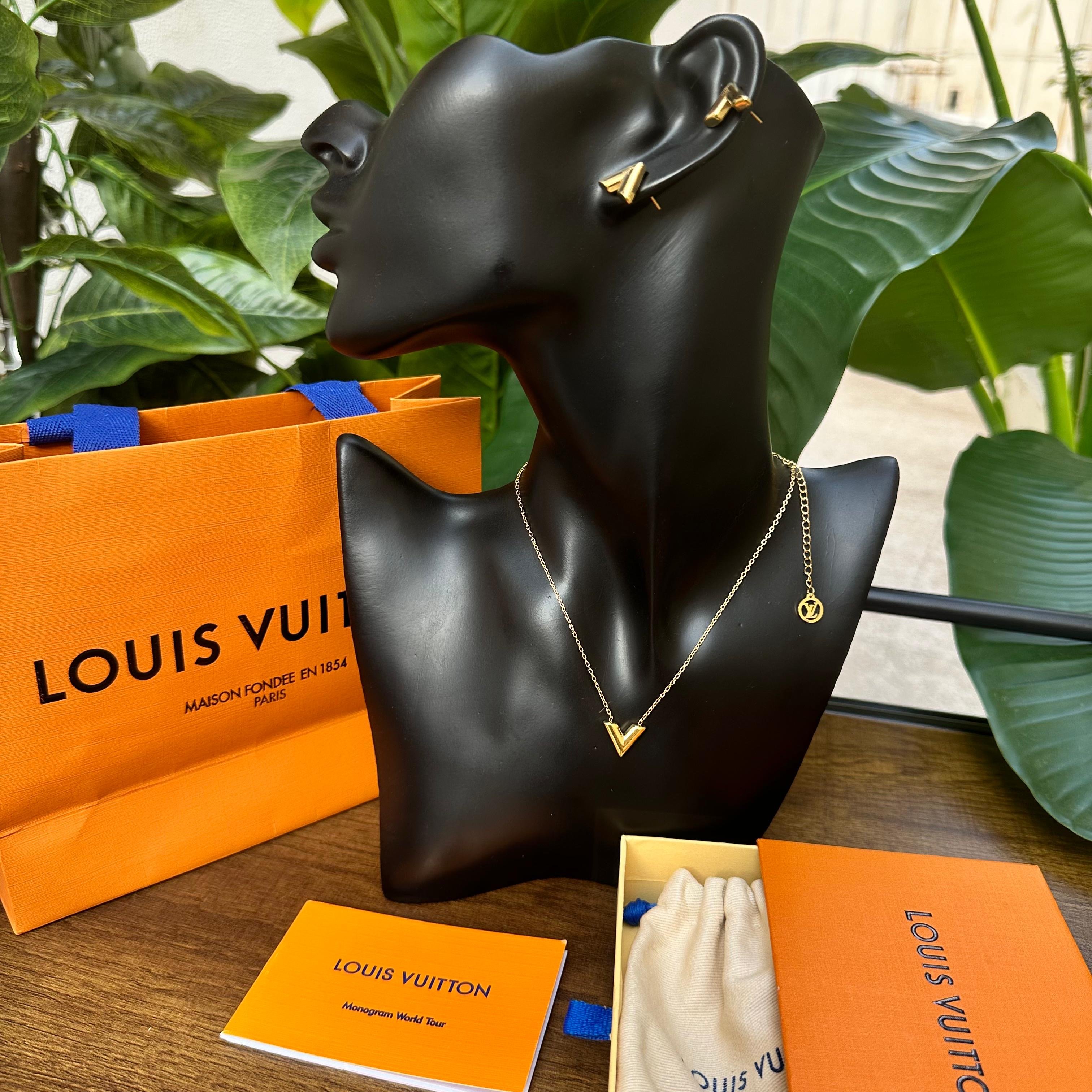 طقم ناعم من لوي ڤيتون بلون ذهبي لامع، يتكوّن من سلسلة رقيقة مع حلق بتصميم V الأيقوني المميز. تصميم بسيط وراقي يعطي لمسة فخمة تناسب كل إطلالة.