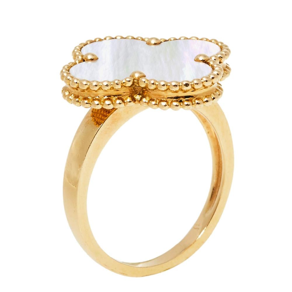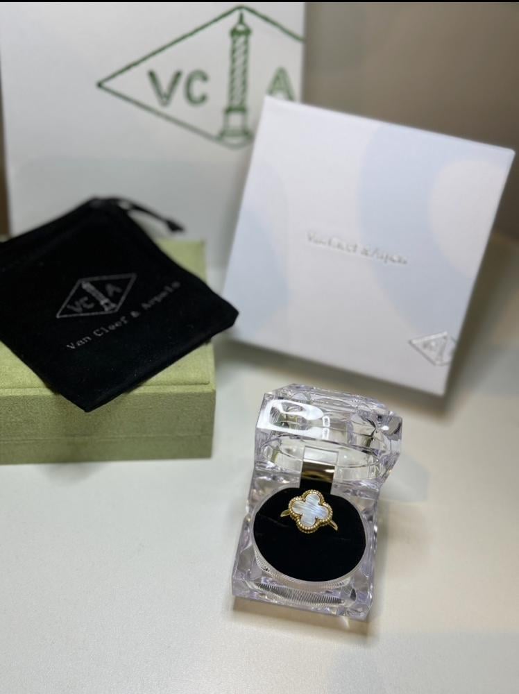 خاتم أنيق من فان كليف بتصميم الوردة الكلاسيكية بلون صدفي لؤلؤي يعكس الرقي والنعومة. الإطار الذهبي يضيف لمسة فخمة تنسجم مع جودة ماستر كواليتي والتفاصيل الدقيقة المستوحاة من التصميم الأصلي. مثالي لإطلالاتك اليومية أو كمجموعة مكمّلة مع الاسوارة.