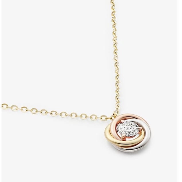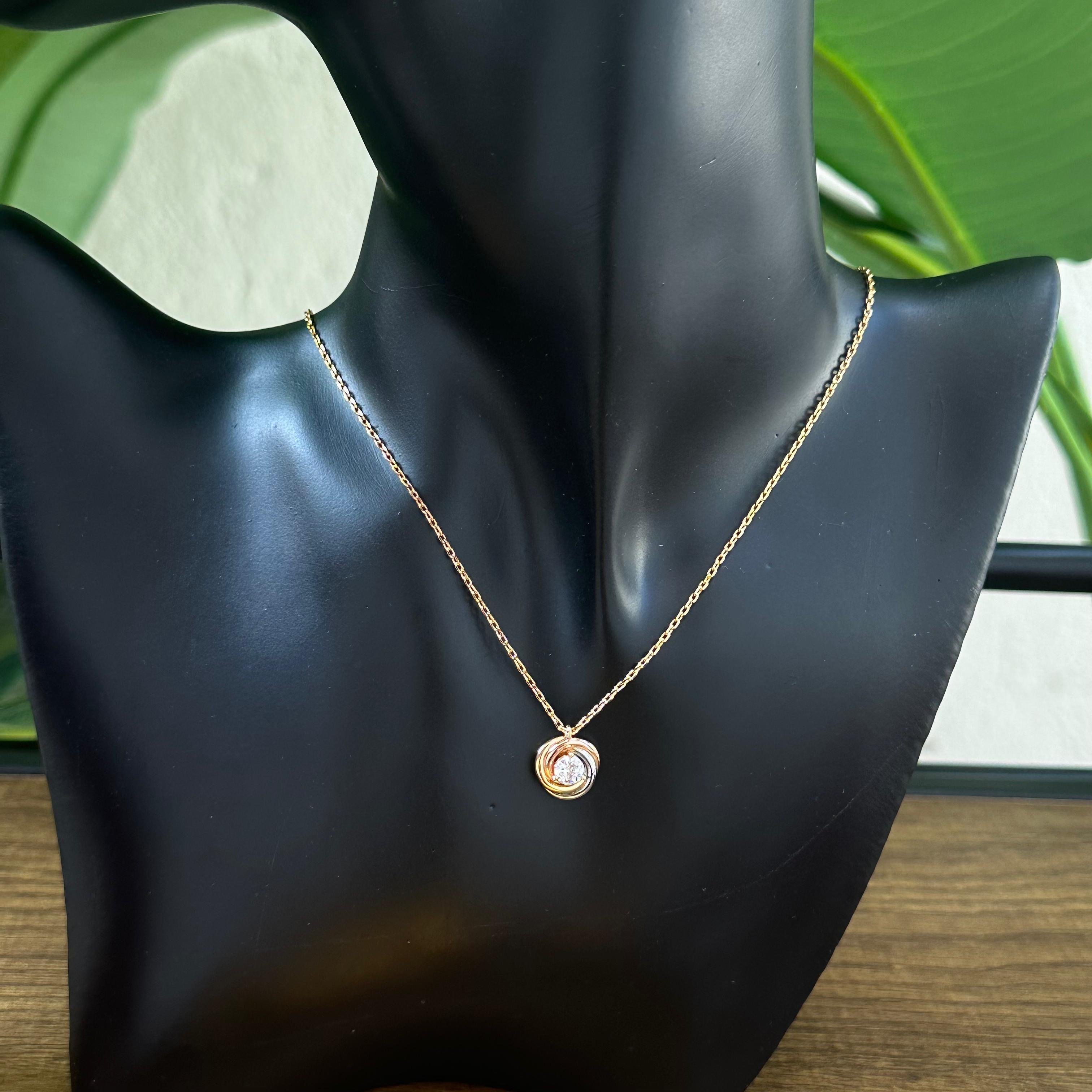 تصميم أيقوني من مجموعة Trinity de Cartier الشهيرة، يجمع بين ثلاث حلقات متداخلة من الذهب الأصفر والأبيض والوردي، تتوسطها فص ألماس فاخر يضفي لمسة فخمة وراقية.